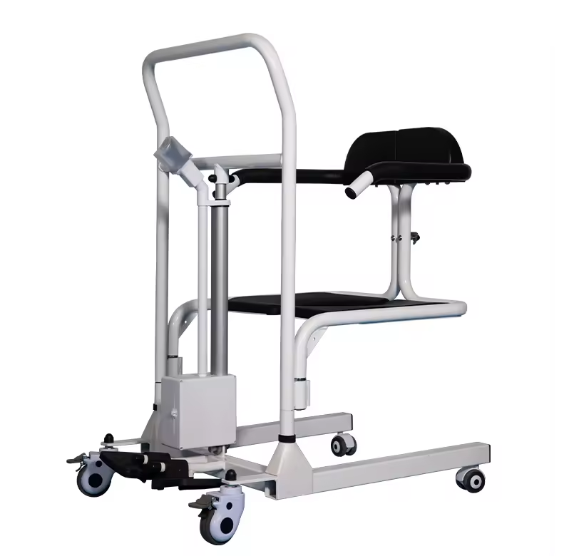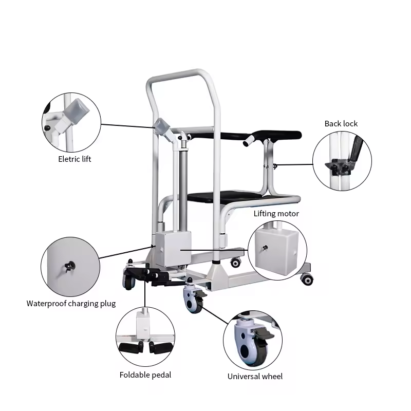Den elektriske liftoverførselsstol giver en praktisk og sikker måde at overføre patienter på. Omsorgspersoner kan let overføre patienter til senge, badeværelser, toiletter og andre placeringer. Kombinationen af sort og hvid er smuk og stilfuld. Hovedlegemet vedtager stålstruktur med høj styrke, som er robust og holdbar og sikkert kan modstå en belastning på 135 kg. Det kan ikke kun bruges som en overførselsløftstol, men også som en kørestol, toiletstol, brusestol. Det er det første valg for plejere og deres familier.