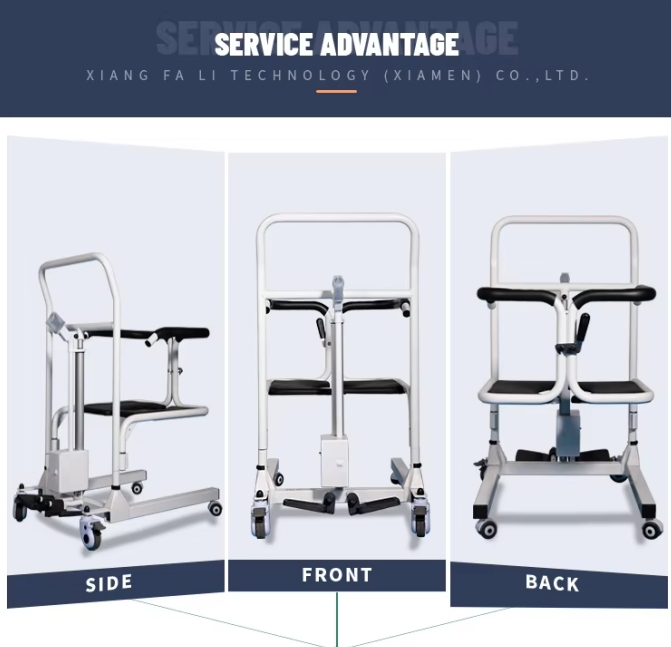 Den elektriske liftoverførselsstol giver en praktisk og sikker måde at overføre patienter på. Omsorgspersoner kan let overføre patienter til senge, badeværelser, toiletter og andre placeringer. Kombinationen af sort og hvid er smuk og stilfuld. Hovedlegemet vedtager stålstruktur med høj styrke, som er robust og holdbar og sikkert kan modstå en belastning på 135 kg. Det kan ikke kun bruges som en overførselsløftstol, men også som en kørestol, toiletstol, brusestol. Det er det første valg for plejere og deres familier.